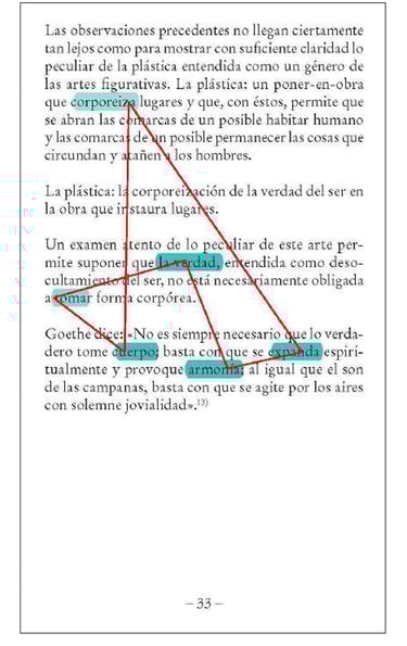 En vez de escoger las impurezas del papel, se opta por escoger los conceptos clave del texto, tal y como han sido impresos en la edición traducida por Jesús Adrián Escudero en el 2009 por la Editorial Herder SL (Barcelona). De este modo, los conceptos escogidos han sido; “corporeizar”, “verdad”, “tomar”, “cuerpo”, “expanda” y “armonía”. Así, la figura que surge tras enlazar con líneas rectas un concepto con otro, se forma una figura geométrica abstracta. Esta figura, se toma como una vista frontal y después se reinterpreta bajo los ejes X, Y y Z. El proceso de adaptación tridimensional, se forma a través de la línea compuesta por el trazo de un láser rebotado en cinco espejos.